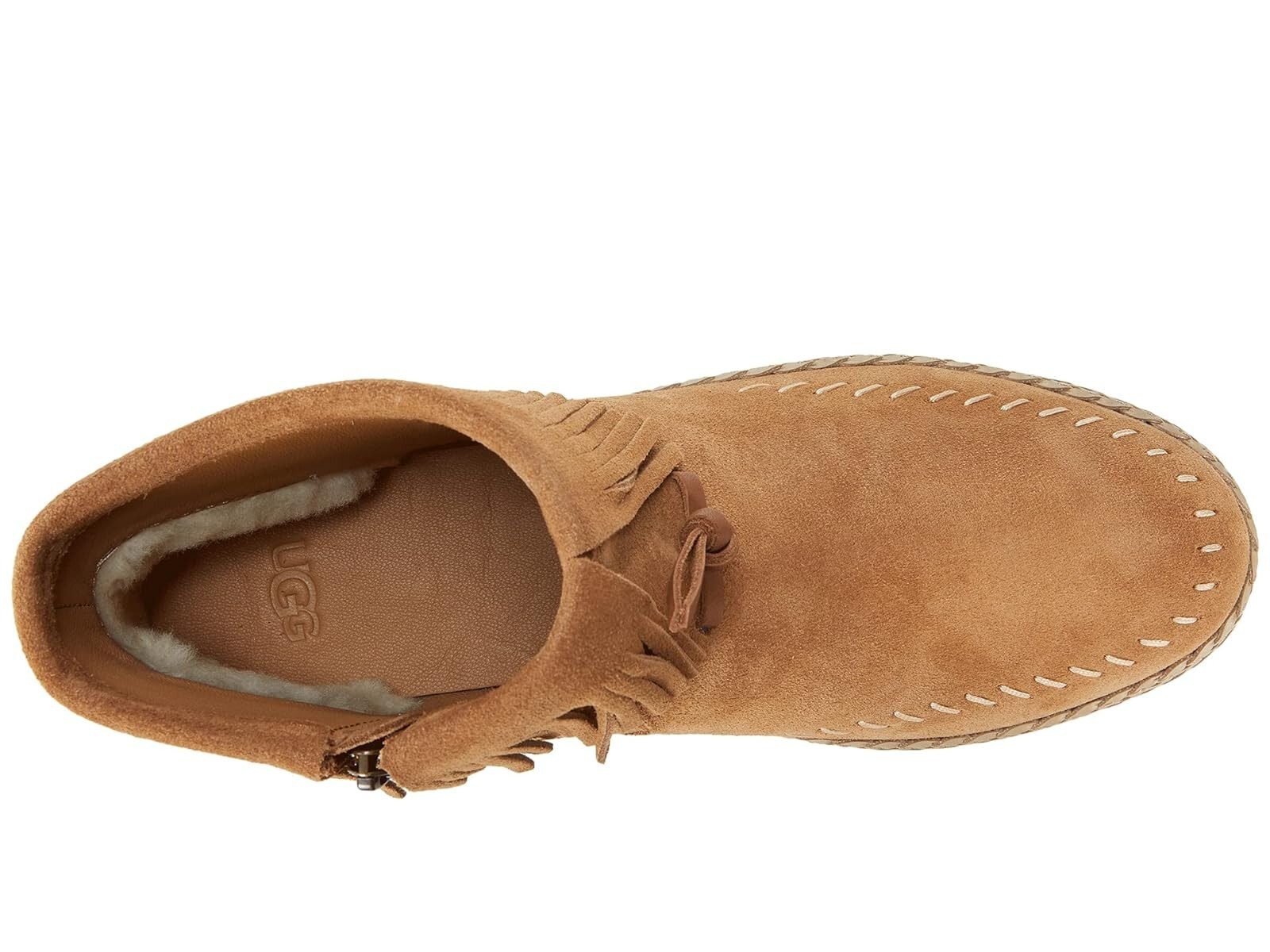 Crafted from rich suede with playful fringe details and braided trim, the Kennadi adds boho-inspired style to any look. Its versatile silhouette pairs perfectly with jeans and printed dresses, while the medial zipper offers effortless entry.Suede upperMedial zipper, Leather lacesUGGplushTM 80% upcycled wool, 20% lyocell heel lining, and textile lining (51% UNIFI RPET, 49% polyester)Leather socklinerDual density foam footbedSynthetic leather braided midsoleMolded rubber outsole4" shaft height0.75" heel heightEmbossed UGG® logo on heelBest for: CasualRN 88276Item No. 194715661097